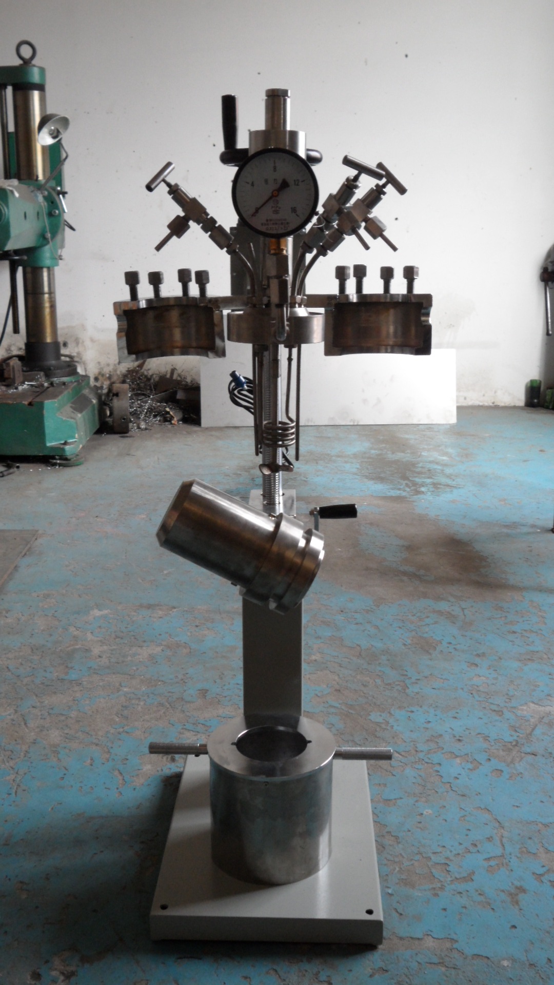 該系列反應(yīng)釜是我公司近年來(lái)研制的新產(chǎn)品,它綜合了國(guó)內(nèi)外高壓釜的優(yōu)點(diǎn),具有外型美觀、結(jié)構(gòu)緊湊、操作方便等特點(diǎn),釜體與釜蓋間采用快開(kāi)式卡環(huán)是法蘭聯(lián)接,靠擰緊8個(gè)螺栓即可將釜蓋與釜體密封,上釜及開(kāi)釜時(shí)間短,方便操作;通過(guò)旋轉(zhuǎn)設(shè)備上的升降手輪帶動(dòng)絲桿轉(zhuǎn)動(dòng)將釜體升起,支架上設(shè)有翻轉(zhuǎn)手柄,轉(zhuǎn)動(dòng)手柄可將釜體繞水平線旋轉(zhuǎn)120度,便于倒料及清洗釜內(nèi)殘物。該反應(yīng)釜投放市場(chǎng)以來(lái),深受廣大科研人員的喜愛(ài),是目前國(guó)內(nèi)外試驗(yàn)室最為理想的高壓化學(xué)反應(yīng)試驗(yàn)裝置。